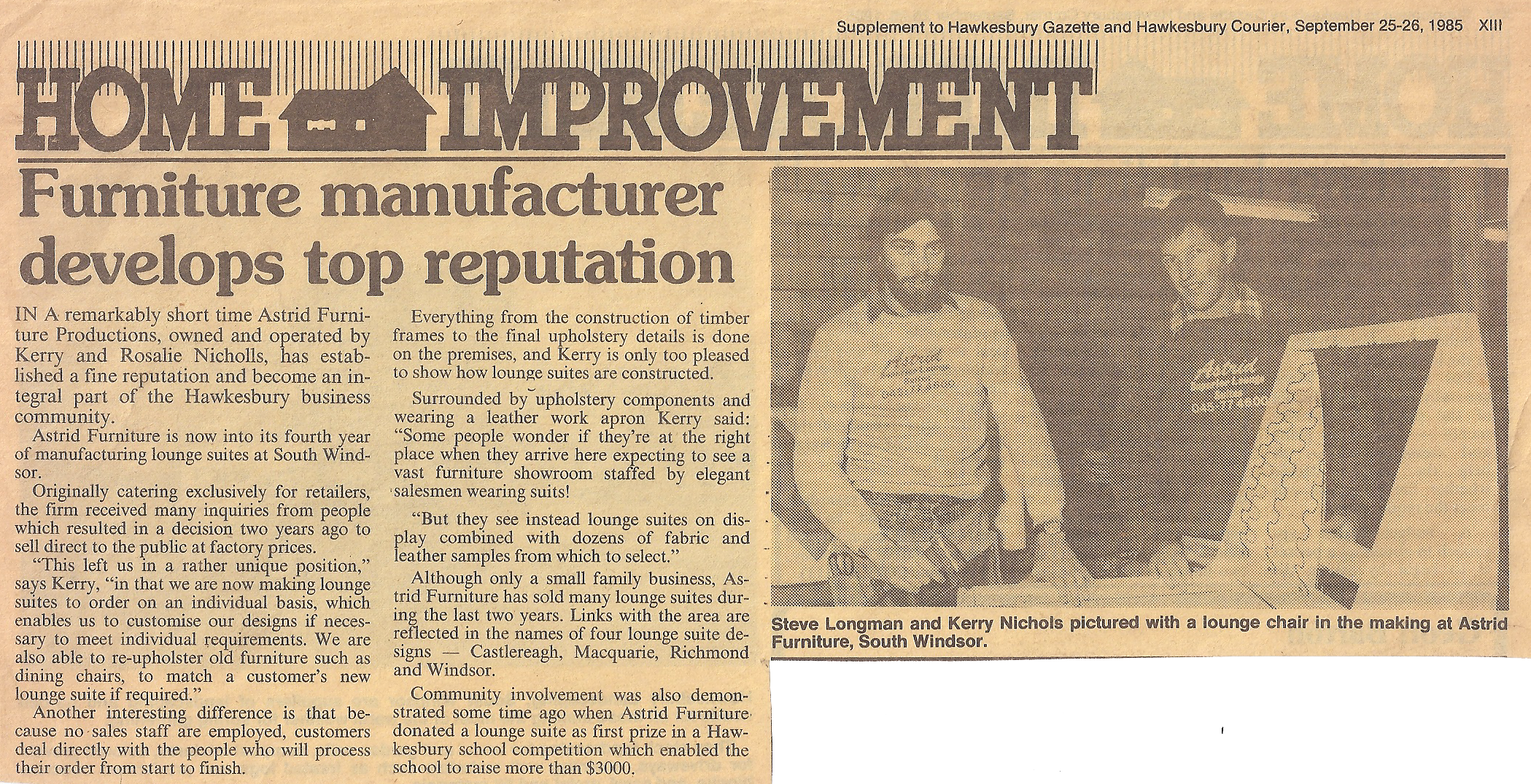 Astrid Furniture & Reupholstery is an Australian owned and operated company. We have been proudly upholstering quality lounge furniture in the Hawkesbury, Penrith, Blue Mountains and the Hills areas of New South Wales since 1980. Astrid Furniture & Reupholstery combines the manufacture of customised lounge furniture with a full reupholstery and restoration service.